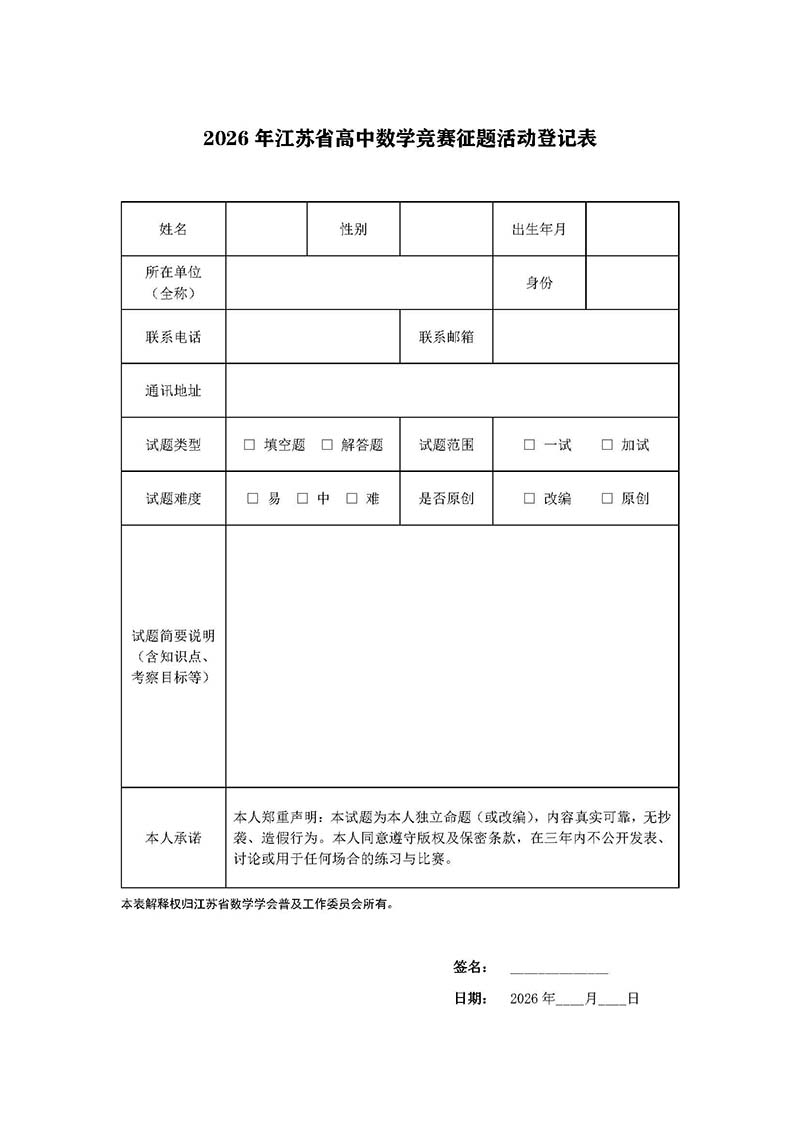 附件 2026年江苏省高中数学竞赛征题活动登记表