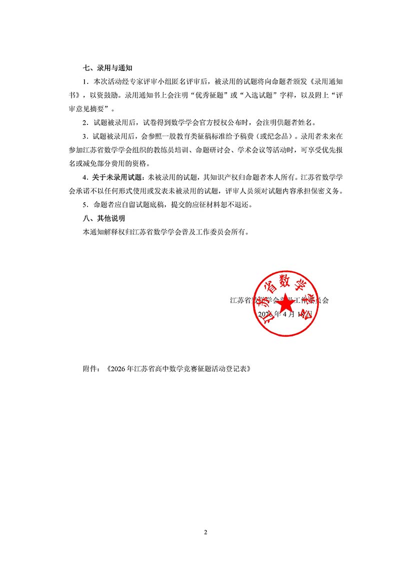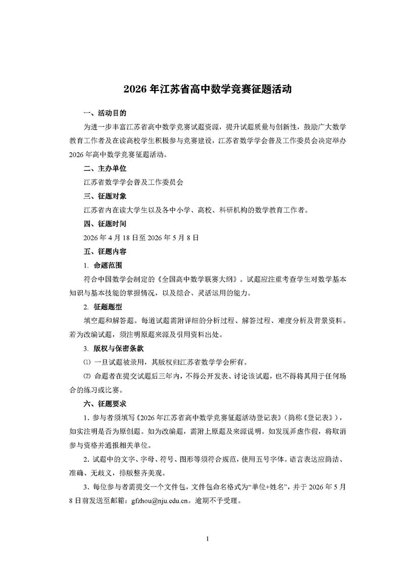 2026年江苏省高中数学竞赛征题活动
